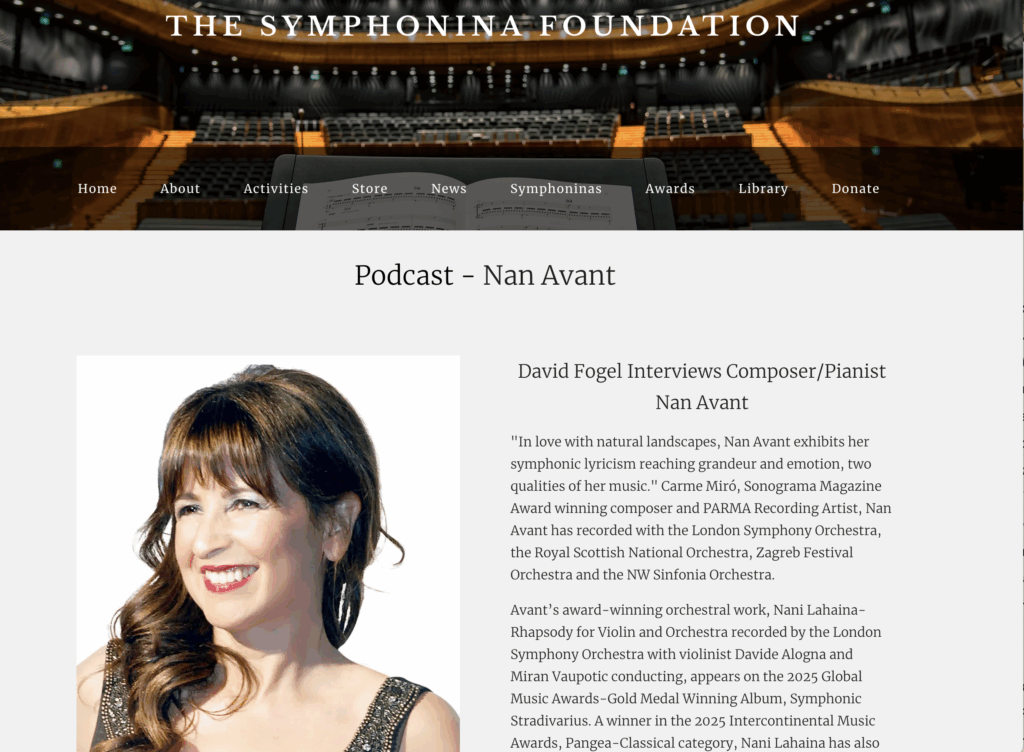 Many thanks to David Fogel of the Symphonina Foundation who interviewed me on his podcast. Click on the image or the link below for the entire audio interview. David is not only a composer but a scientist and engineer with a Doctorate in Engineering who has developed outstanding technology. You can find him in Google searches. Click the Image to read and listen to the podcast